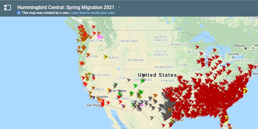 Hummingbird Central focuses on the northward movement of just hummingbirds. The red icons are our own ruby-throated hummer.