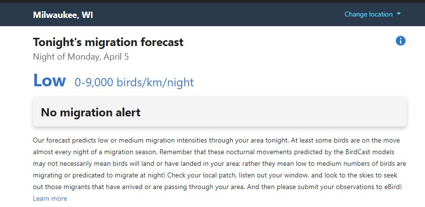 Birdcast Combining weather surveillance data and tools to track and predict bird movement. US maps provide a big picture look at migration. To check local conditions use Birdcast alert to get the local migration forecast.