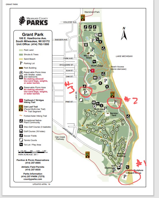 From beach (called the Oak Creek Outlet to Lake Michigan on eBird), there we will car bird up to the bird feeders (#2) and the to pond by the tennis courts (#3).