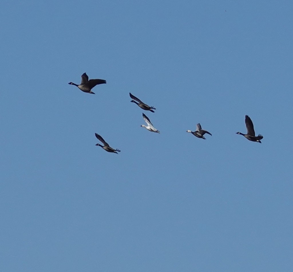 Alex had one more field for us, Stop 4, Flooded Ag Fields. Scanning through more Canada Geese, a bright, white snow goose! And next to it a blue morph snow goose. We watched until they flew away. Very cool to see the blue morph and the white morph side by side.