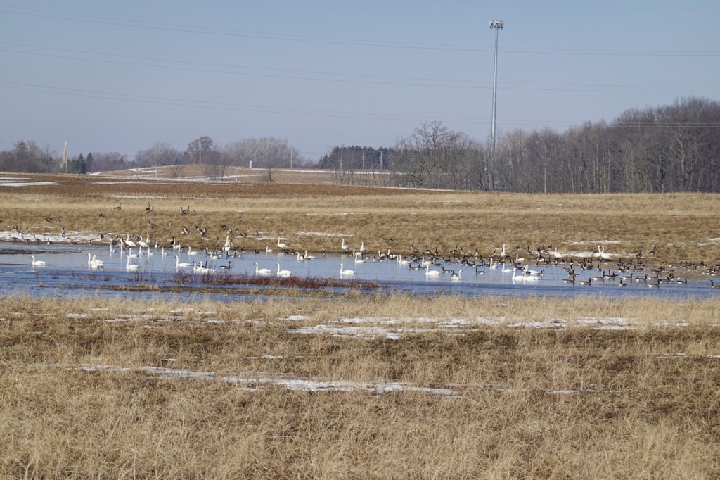 Onto Stop 3, KK and H Ag Fields. Here we were greeted by more Canada Geese And 60 Tundra Swans! They are beautiful. We heard Horned Larks and one flew onto a grass tussock right in front of us.