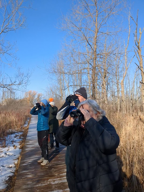Alex started the walk by pointing out the grey morph Screech Owl in the box above the pond. We looked through a raft of Red-breasted Mergansers on the lake and found a few Goldeneyes. Walking the wooded bluff trails we saw or heard a lot of expected birds, A number of us had FOYs as we approached the north side of the Ulao pond – Kildeer (heard), Eastern Towhee (heard) and Brown-headed Cowbird (seen and heard).