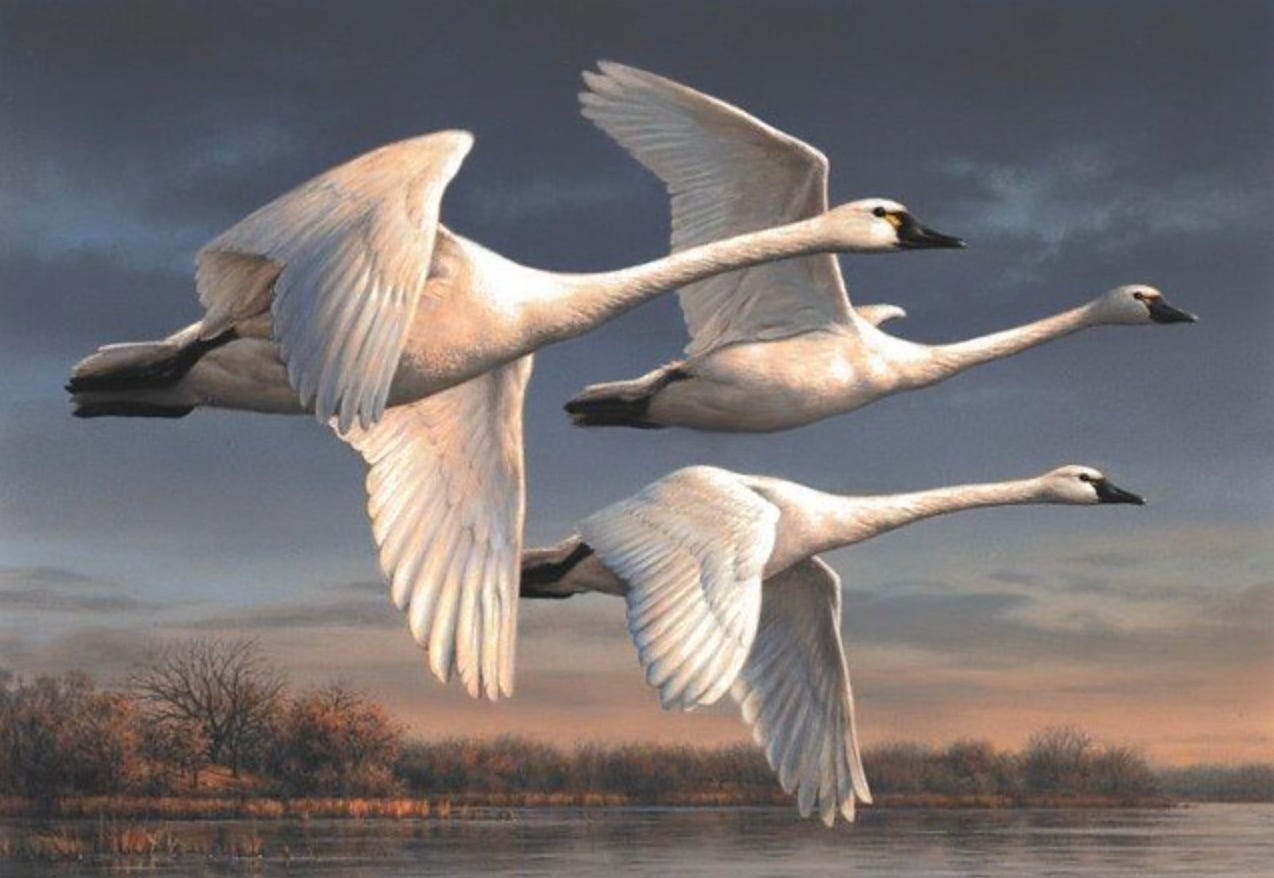 Today I had a lovely bird surprise. While walking the dog in the bright afternoon sun, I heard a strange call. I looked all around to try and place it. Finally looked up to see 8 Tundra swans flying over!