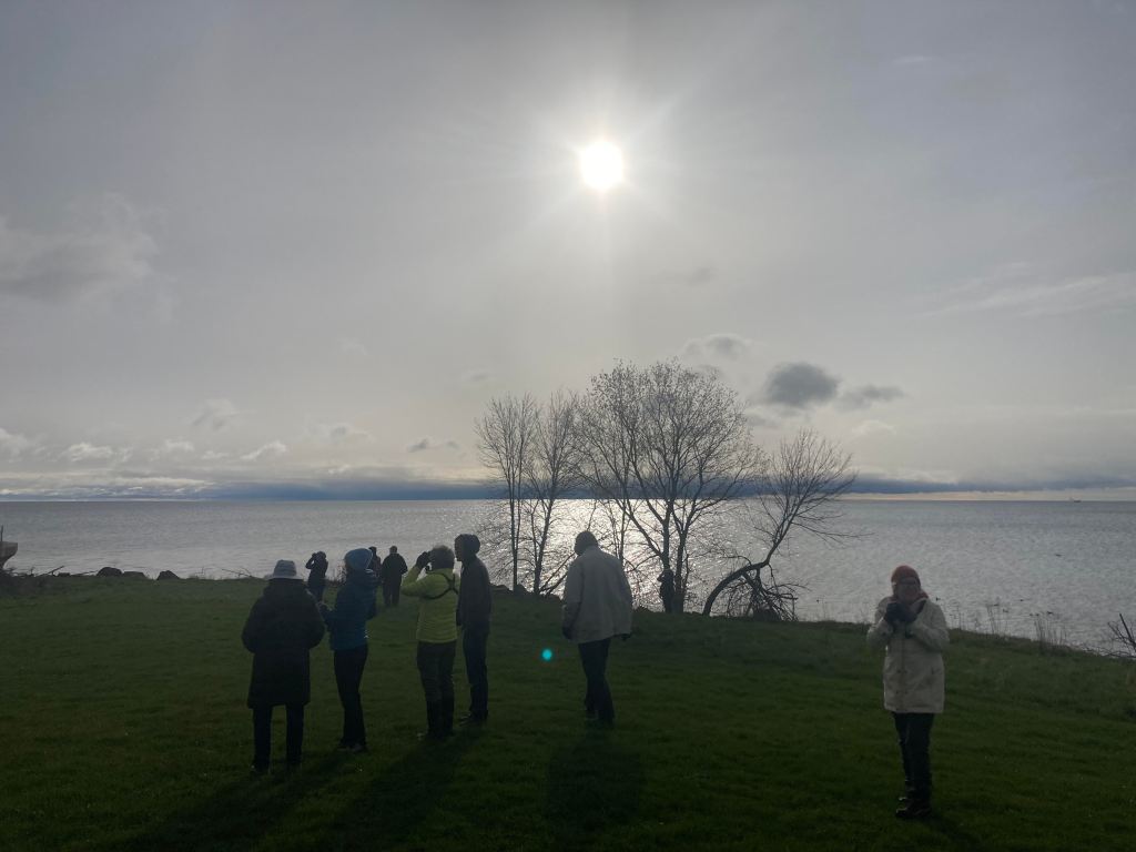 As we were about to start back up the hill a small passel of Yellow-Rumps caught our eye. Among them was a Black-Throated Green Warbler. And amidst but not easily visible – we walked right by it on our way down – was a Screech Owl (red morph). Soon after a juvenile Bald Eagle flew over.