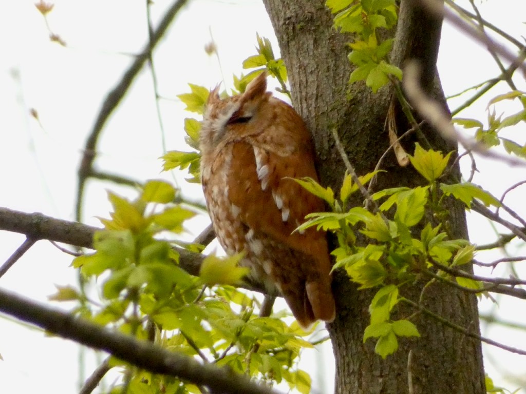 Screech owl can be red, gray or brown, “most individuals are gray with intricate black markings, but some are bright reddish brown with reduced markings. (And some others are an intermediate gray-brown.) Overall, the “red” birds make up roughly one-third of the population.” Kenn Kaufman “Ask Kenn: What’s Up With Color Morphs and Phases?”