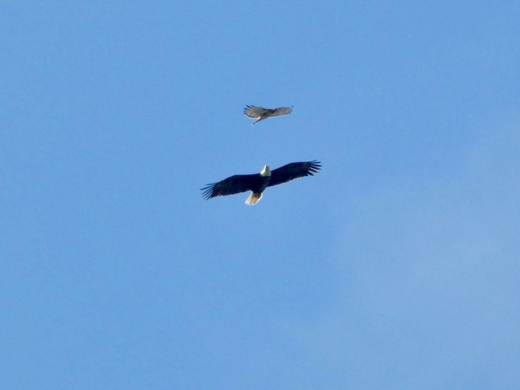 Next stop was Riveredge. We stuck to the river trail. The warblers songs were all around us. But before we could pay attention to them we watched a Bald Eagle and Red-Tailed hawk ‘talon’ it out.