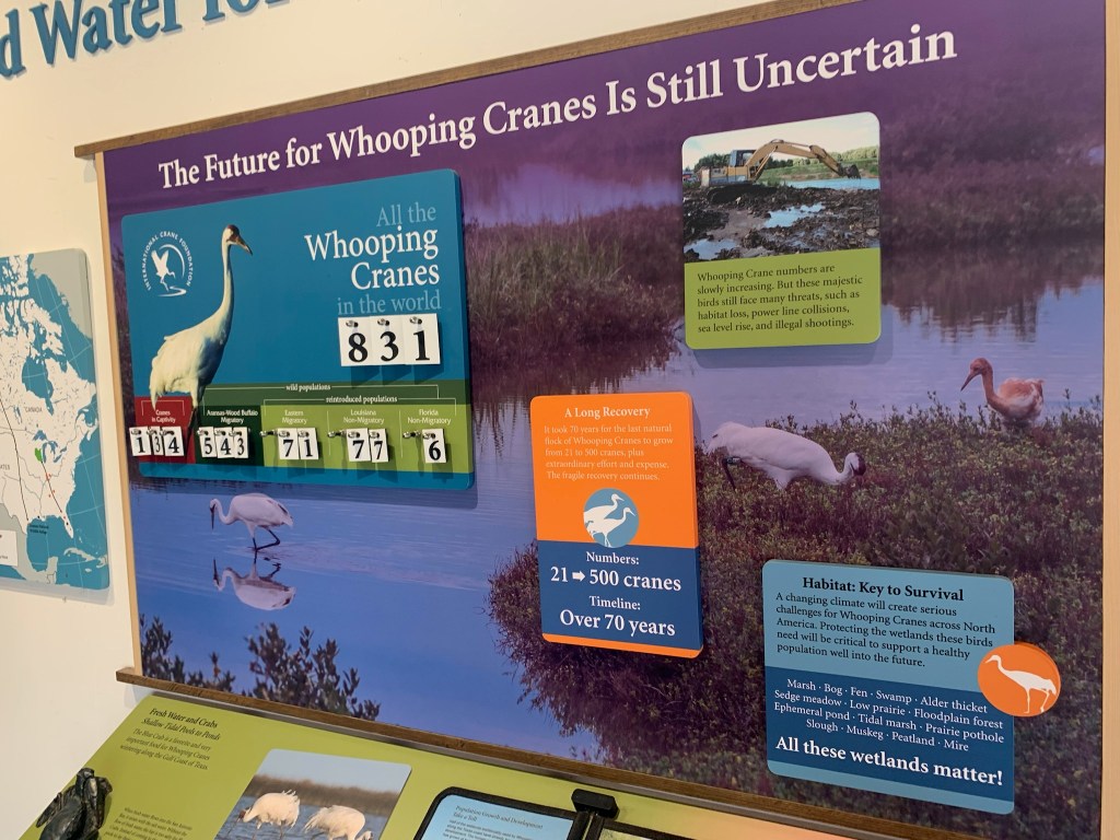 – While straight along the neck, a Whooping Crane’s trachea bunches up along their sternum, totaling five-feet in length. This adaption gives their call added resonance allowing it to be heard miles away.