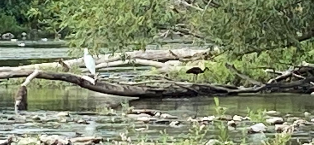 If it moves on, there will be plenty of other birds. The trees were full of warblers and Cedar Waxwings. In the river, there were dueling Great Blue Herons and Great Egrets as well as Wood Ducks, Mallards, Kildeer, and Spotted Sandpipers.