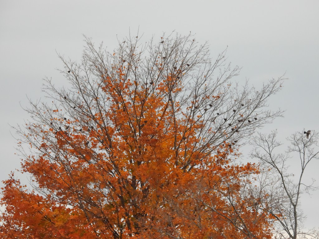 A footnote for the photo of the tree with the starlings there are also several American robins present. One is flying away.