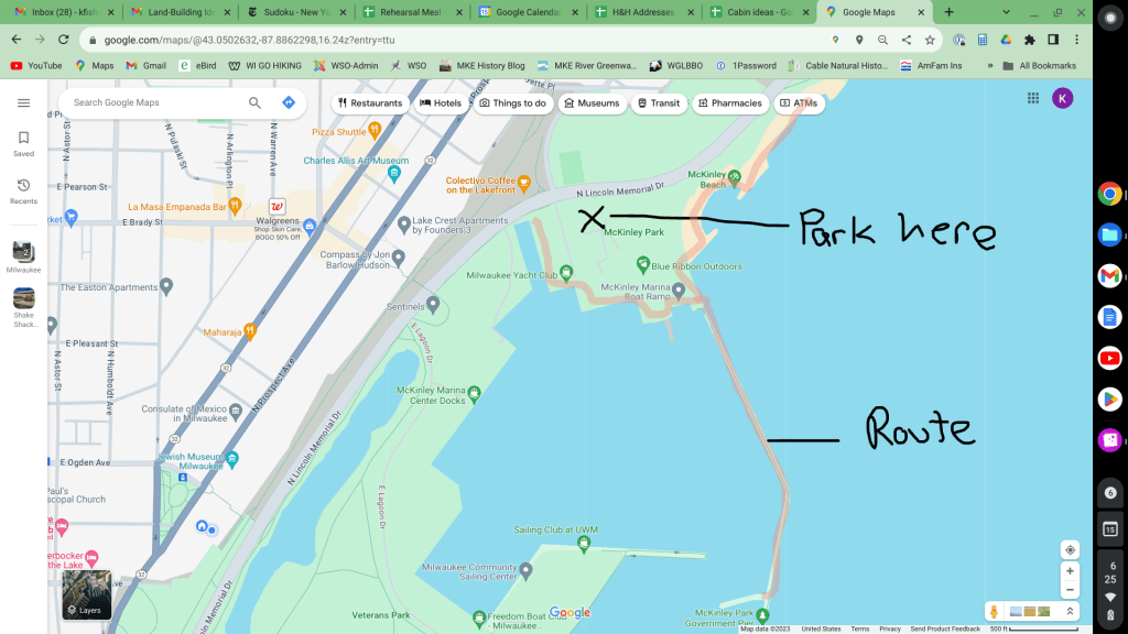 Park in the lot indicated by the X. Route will be the shaded-path along breakwall and up lakefront north of McKinley.