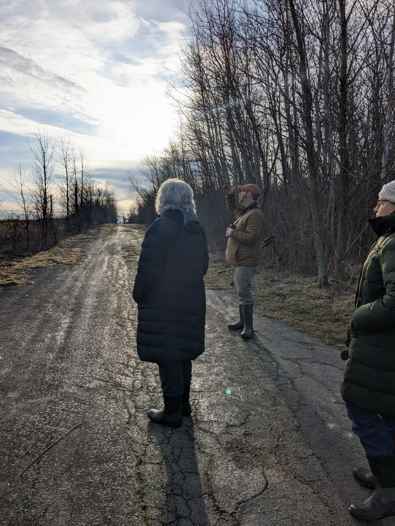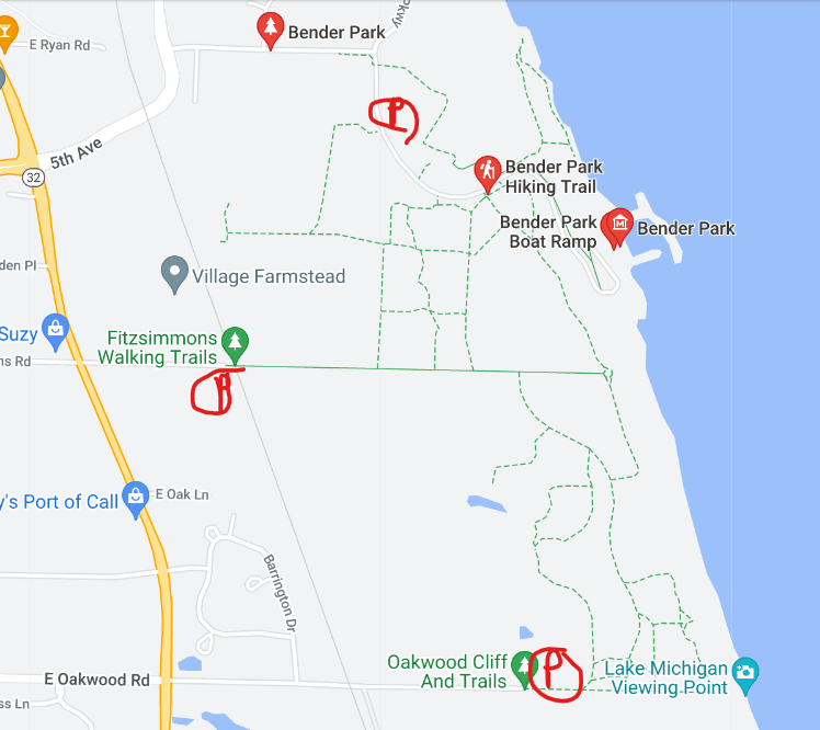 As we gathered in the muddy Bender Park north lot, we were treated to the sounds and sight of a flock of Tundra Swans flying northwest. It was a great start to good morning of birding. Brad Bumgardner, Indiana Audubon president and new Oak Creek resident, birds Bender a lot! Like a whole lot, he has over 180 lists for Bender. He took us on a nice loop. In the woods we had Brown Creepers, Golden-Crown Kinglets, Fox Sparrow, and a Swamp Sparrow. Coming along the south side of the fields, we saw many American Robins, Northern Flickers and two Phoebes. Looking down on Lake Michigan, we saw Bufflehead, Mallards, and a Lesser Black-Backed Gull. Tree Swallows, Meadowlarks and Cowbirds flew above us as we made our way back to the lot. It is an excellent park with a variety of habitats! Photo below shows various parking lots and entries to the trails.