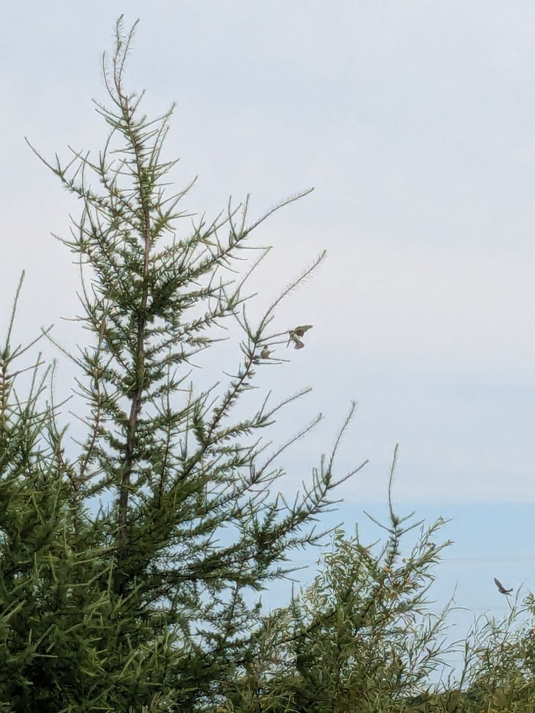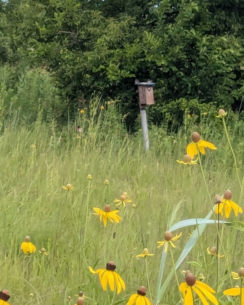 Mequon Nature Preserve. After a one-hour rain delay, four of us met at MNP. We started on the eastern side winding around the ponds and coming back on the trail north of the building. We saw a male Baltimore Oriole in a willow tree and heard a few Common Yellowthroats and Red-winged Blackbirds around the first pond. All of the Tree Swallows using the nest boxes seemed to have fledged. There were lots of Tree Swallows swooping around us. We heard and then saw an Eastern Meadowlark along the north fence trail.