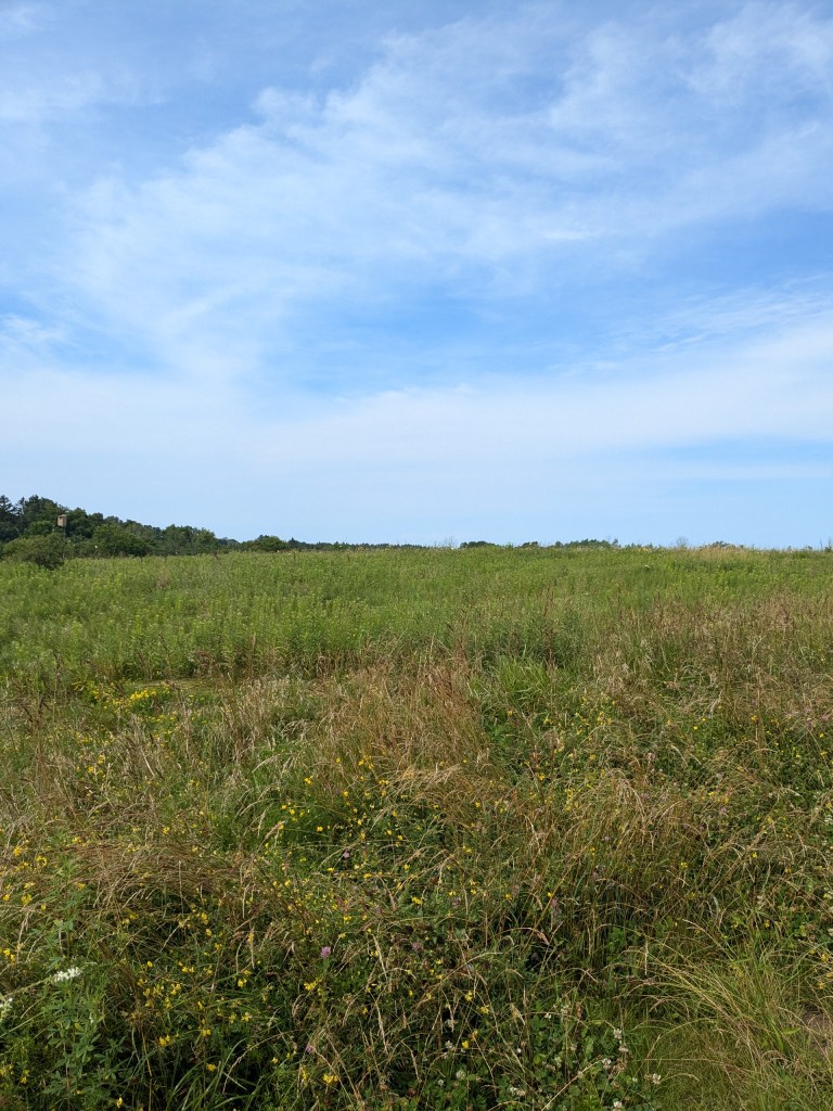 As we headed up the Lower Link Trail we heard a Henslow’s Sparrow. By the time we got to the Bluebird box we were hearing two. Soon after that Katie spotted one farther up the hill on a stalk. And then a second Henslow’s flew by the perched one. That made four! As we still had not seen a Dickcissel we continued up the north trail through the prairie. Marilyn heard a Sedge Wren in the field. We soon saw it too. A quick side trip to Paul’s Pond bridge yielded two Marsh Wrens, a Hooded Merganser and half dozen Mallards. The day was heating up by now. The trail back to the lot had another Common Yellowthroat, Sedge Wren, Blue Jays and an Eastern Bluebird.