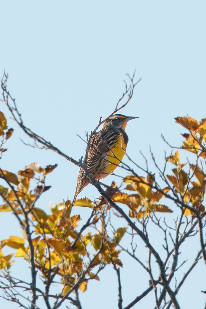 The morning started out chilly at Mequon Nature Preserve. Nine of us walked up the hill listening and looking. Across County Line Rd we could see hundreds of Canada Geese. We headed for Christine’s Painted Pond hoping for some shorebirds. There was not much happening there as we approached the shrub line that crosses the path Joan heard an Eastern Meadowlark. Soon we all heard them. A number of sparrow species, Eastern Bluebirds, and an Orange-crowned warbler were hanging out in the grasses and shrubs.