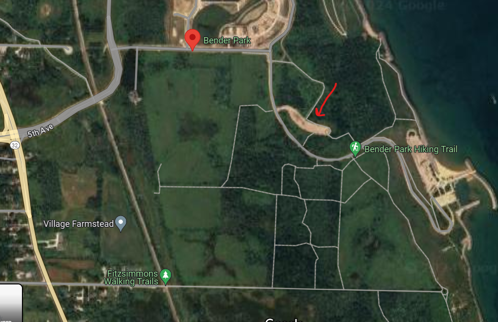 Meet in the dirt parking lot by the red arrow. Bender is a great park with a variety of habitats: wooded trails, some creek beds, grasy fields and a trail along the bluff for great Lake Michigan views.