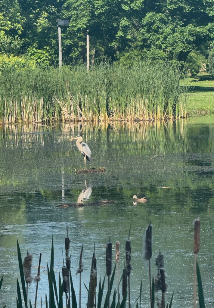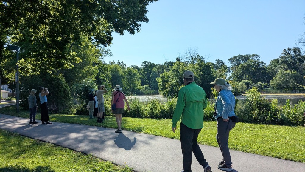 We had a beautiful walk at Humboldt Park. Kyle Arpke, both a birder and board member of Humboldt Park Friends, introduced us to the park and took us on his route. The birds put on a fabulous show! Before we all arrived a Cooper’s Hawk snatched a Red-winged Blackbird and used a light pole top as its brunch spot. The second meal we watched consumed was by a Great-blue Heron. As we watched the heron avoid a swooping Red-singed Blackbird, the heron dunked its head and came up with a large, plump, shiny goldfish. It took one straightening toss and one swallow to rid the pond of that eco-system disrupter. Goldfish do not belong in park ponds, checkout better ways to break-up with your goldfish and more about how they damage pond ecosystems: How to Break-Up with your Goldfish (The Right Way) Additional birds spotted on the pond included an Eastern Kingbird, female Wood Duck, Green Heron, Eastern Pewee, Canada Geese, and four cute juvenile Mallards.
