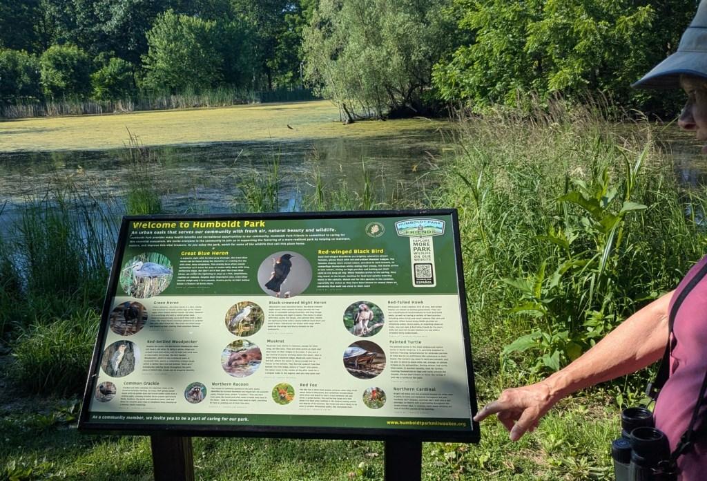 As we headed to the smaller pond on the southeast corner of the park, we saw or heard Baltimore Oriole, Red-headed Woodpeckers, Northern Flicker and . But the highlight was the baby racoons looking out at us. We ended the morning at the new pollinator garden along the pavilion sidewalk planted by Humboldt Park Friends. It will be a lovely spot for butterflies, moths and birds. Humboldt Park has lots to crow about, it was just named a Historic Landmark by the Bay View Historical Society. Congratulations!