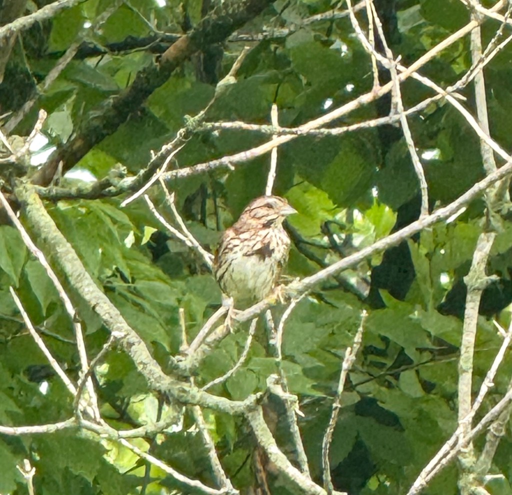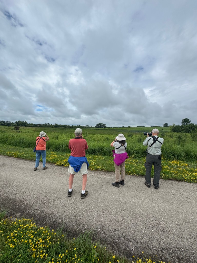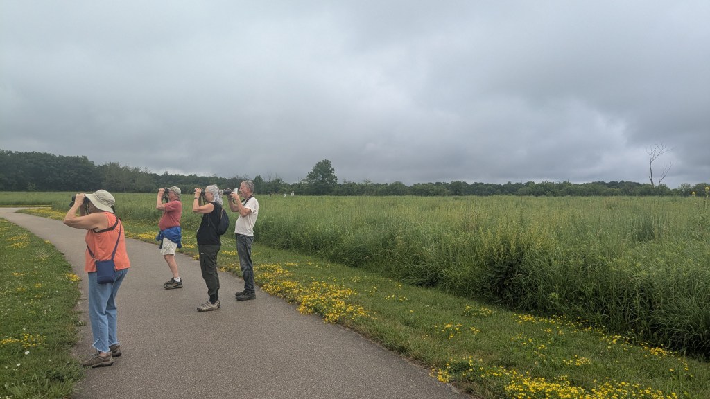 In the Pleasant View parking lot, the eleven of us were greeted by another squad car (this one just on break) and a singing Eastern Meadowlark. The tall grasses, clovers, milkweeds, and coneflowers along the paved trail, hid a Field Sparrow, Savannah Sparrows, Song Sparrows, and American Goldfinch. We also saw or heard Indigo Buntings, Northern Cardinals, Northern Flickers, Cedar Waxwings, Yellow Warblers, Eastern Kingbirds and Common Yellowthroats. Flyovers by Green and Great-blue Herons were fun to see as well. Merlin picked up Dickcissel and Bobolink at different times, but none of us saw one. The sky stayed overcast, while heat and humdity brought a sauna-like feel to the morning. We ended with 37 species between the two spots, that was three new species for Burchbender Trail and 13 new species for Pleasant View! See more pictures at Signs of Life at Estabrook Park.