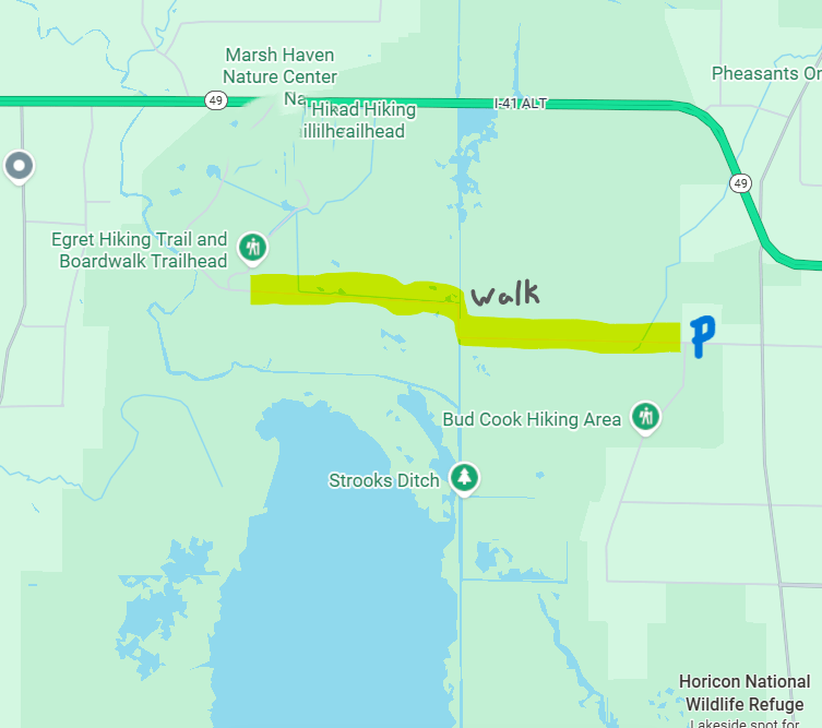 We will either be walking all of Old Marsh Road from Point Rd (just north of Bud Cook Hiking Area) east to Egret Trail parking lot on the west. Or doing an out and back on portions of the east and west end. All the way is 3.5 miles of gravel surface and level terrain. Bring a hat, sunscreen, water, and bug spray.