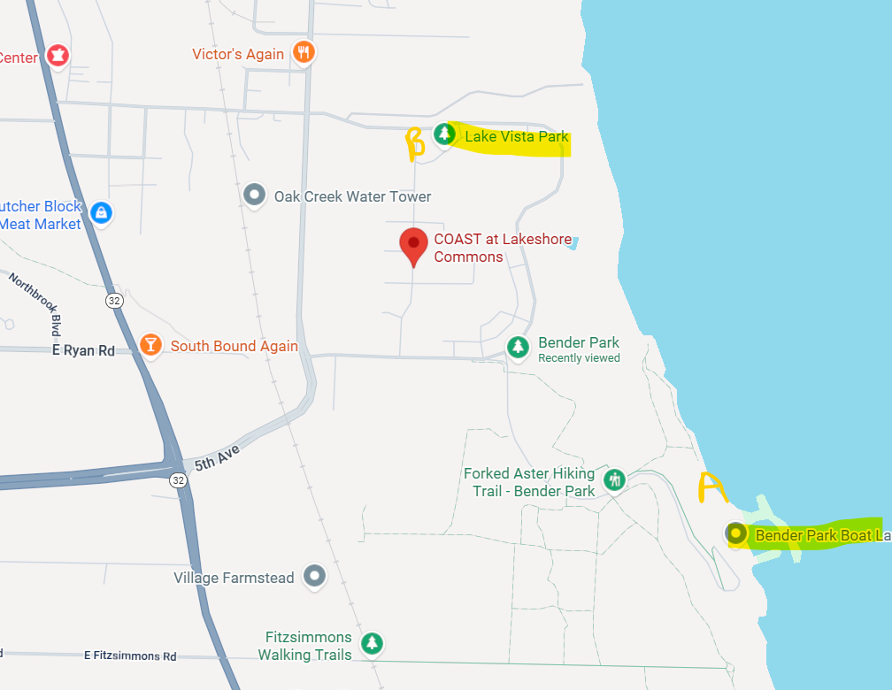 4503 E Ryan Rd, Oak Creek – Meet at Beach parking lot just north of Boat Launch (A on the map)