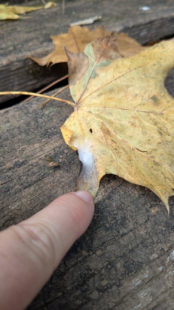 We took a coffee, cookie, and brownie break in the Hearth Room of the Nature Center before heading down to the lake. A few Buffleheads and Red-breasted Mergansers were floating on a calm Lake Michigan. On the way back up the Elizabeth Trail, we stopped to check out some maple leaves with (we think) spider egg nests on them.