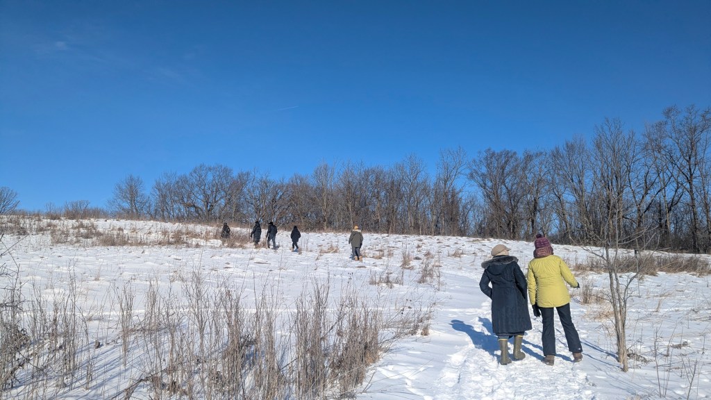 Thirteen birders started at the Wehr bird feeders, counting Wild Turkeys, Mourning Doves, and one Yellow-rumped Warbler. We set out around the lake counterclockwise. Our crunching on the snow made it difficult to hear birds so we stopped frequently to look and listen. And it is good we did, as we heard a Belted Kingfisher’s rattle as it flew over the pond. At about the same time a juvenile Bald Eagle flew over. There were several pairs of Downy Woodpeckers moving together around tree tops. There were also Northern Cardinals, Blue Jays, White-breasted Nuthatches, and Dark-eyed Juncos.