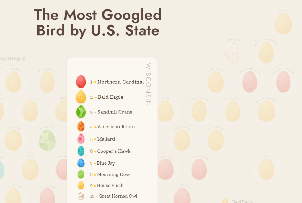 Guess what the most googled bird in the US is? Guess what the most googled bird by Wisconsinites is? Check out this amazing visual summary of google searches for birds, “Searching for Birds” on Visual Cinnamon, including counts and times of year. Every spring, American Robin searches spike. (For Wisconsin, the most googled types of bird is “hawk”, the most googled species is “Northern Cardinal”